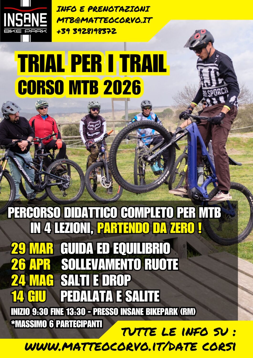 GUIDA ED EQUILIBRIO Un corso di tecnica per chi vuole rivoluzionare il proprio stile di guida, consigliato a principianti e non, per apprendete i fondamenti del trial ed imparare ad applicarli sulla propria bici in ogni situazione! Il corso ha la durata di una mattinata intera dalle 9:30 alle 13:30 per un totale di 4H, ingresso nel bikepark incluso per il resto della giornata, possibilità di prenotare il pranzo.